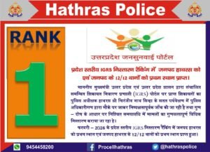 हाथरस! जनसमस्याओं के त्वरित और गुणवत्तापूर्ण निस्तारण के मामले में हाथरस पुलिस लगातार बेहतर प्रदर्शन कर रही है। इसी का परिणाम है कि आईजीआरएस पोर्टल पर शिकायतों के निस्तारण में हाथरस पुलिस ने लगातार छह माह से प्रदेश में पहला स्थान बनाए रखा है। फरवरी 2026 में भी उत्कृष्ट कार्य करते हुए हाथरस पुलिस को उत्तर प्रदेश में प्रथम स्थान प्राप्त हुआ है।